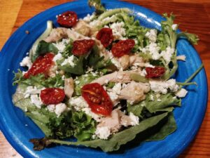 On Saturday, I followed her instructions, using Principe Borghese and San Marzano tomatoes. The resulting beauties are so rich I could only eat a couple of them straight out of the jar. When I added them to the grain bowl I had for lunch, they provided a perfect contrast to the roasted sweet potatoes and beets. So of course I had to try this again, this time with a lunchtime chicken and feta topped salad.